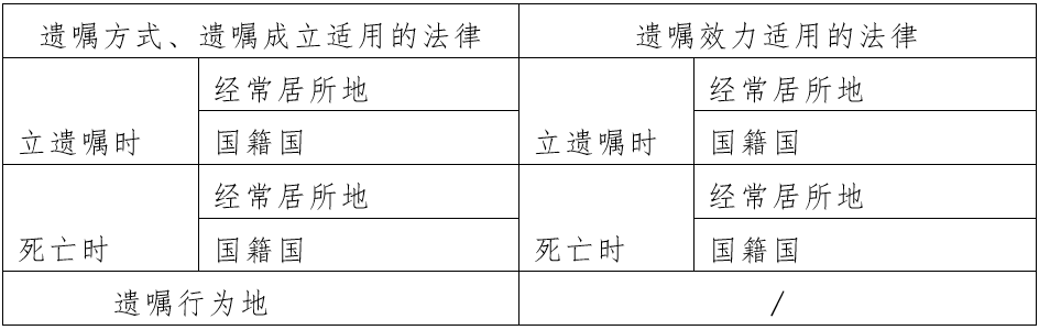 [1] 《中华人民共和国涉外民事关系法律适用法》(简称:《法律适用法》)第三十二条 遗嘱方式,符合遗嘱人立遗嘱时或者死亡时经常居所地法律、国籍国法律或者遗嘱行为地法律的,遗嘱均为成立。
