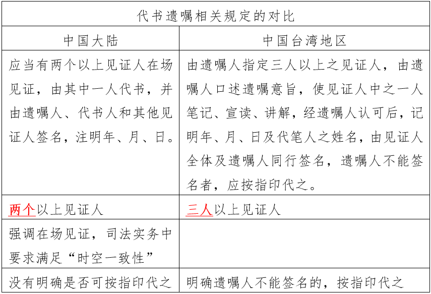 以代书遗嘱为例,中国大陆、台湾地区对于代书遗嘱的要求存在显著差异(具体可参考如下对比表):