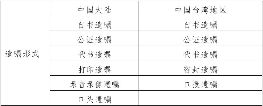 遗嘱形式是否合法有效是影响遗嘱有效性的条件之一,中国大陆、台湾地区的遗嘱形式差异,详见如下对比表: