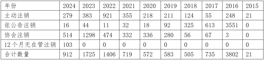 近年来中基协对违规私募及高管的纪律处分数量明显增长,在监管趋严、市场趋紧等多重因素影响下,私募基金管理人主动注销的需求日益增长。根据中基协公示数据,近十年私募基金管理人注销情况如下: