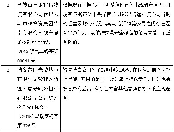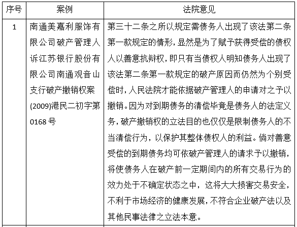 在上述案例1和案例4中,清偿行为是为履行合同所作,债权人接受清偿时并未不知道债务人已经处于破产状态,不具有主观恶意。虽然债务人在受理破产申请前6个月内对到期债务进行了清偿,但管理人无法提供证据证明债权人知道当时债务人出现了破产原因,法院支持了债务人以发生清偿行为时不知道债务人存在破产原因进行的抗辩。在上述案例3和案例4中,法院认为个别清偿行为没有损害其他债权人的主观恶意,出于维护市场交易稳定,不应对善意受偿行为进行撤销。