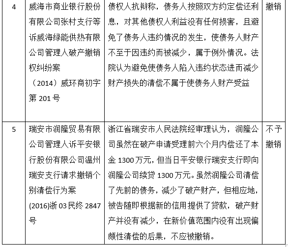在案例5中,企业虽然偿还了旧贷款,但其通过还贷产生了新的信用并根据新的信用获得了新的贷款,产生了新的收益。由于其清偿并没有大于新贷款的额度,对全体债权人的利益并没有造成损失,所以法院认为不应撤销。
