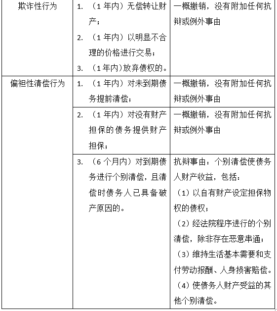 破产撤销权行使的对象是破产受理前临界期内发生的可撤销行为。从临界期的时间划分,可以分为法院受理破产前一年内发生的行为和受理前六个月内发生的行为;从行为性质来分:可分为欺诈性行为和偏袒性清偿行为。其中偏袒性清偿行为是指,债务人在破产申请受理前对法定期间内,以提前偿还未到期债务、对原无财产担保债务提供财产担保、个别清偿等方式,使特定债权人取得原没有的优先受偿地位或获得更多清偿。[1]目前普遍认可的偏袒性清偿行为主要有三类:即第三十一条第3、4项和第三十二条规定的情形。